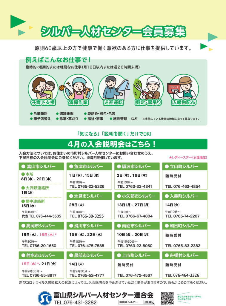 イベント情報 2026年3月23日 4月の入会説明会のお知らせ イベント情報 ※インフルエンザ等感染症の拡大の状況により、入会説明会を中止させていただくことがあります。 お申し込み・お問い合わせはお住まいの地域のシルバー人材センター